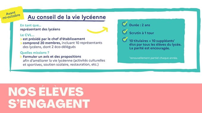 Les élections des délégués de classe et éco-délégués ont eu lieu ou sont en cours (date limite le 4 octobre) et nous souhaitons maintenant vous inviter à participer à la vie du lycée au travers du Conseil de Vie Lycéenne.